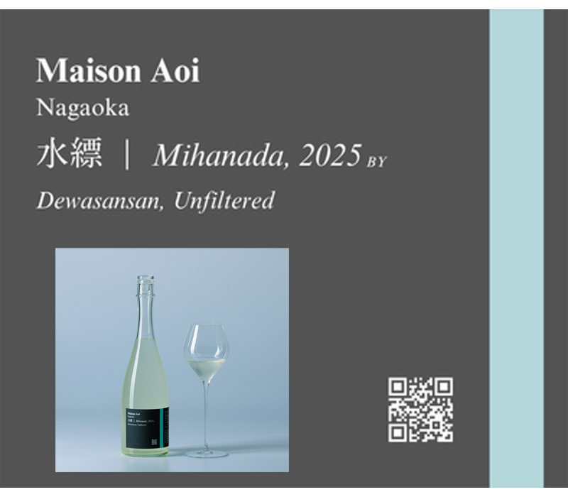 当店が今注目している日本酒の蔵の一つが「葵酒造」です。長岡市で江戸時代から160年続く「長陵」が主要銘柄の高橋酒造が新たに葵酒造として生まれ変わりました。新チームでのチャレンジが始まったのが2024年。そして2025年2月に社名を葵酒造に変更し、酒造り第一弾を世に出しました。Maison Aoi Untitled01です。
